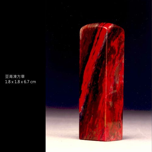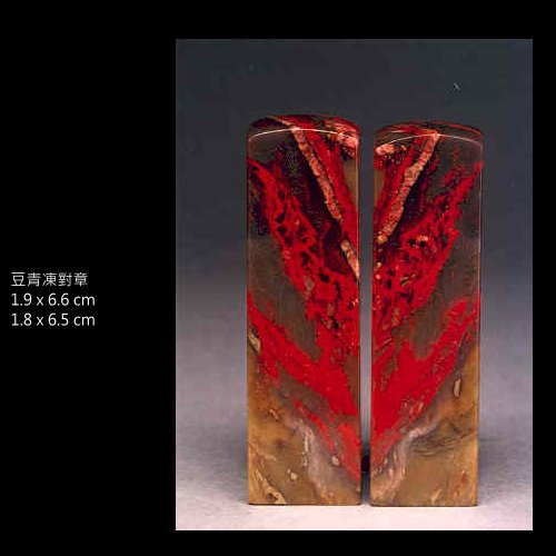 一、豆青地:地色似豌豆青色,微透明,質地清朗純淨,血色鮮豐,灑以紅斑或紅青相間,是昌化雞血的精品種。