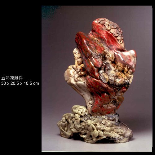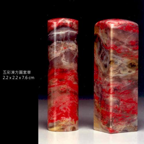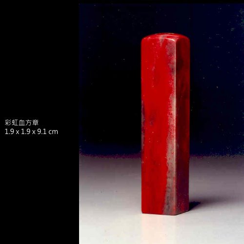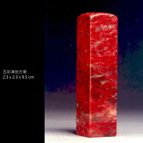 八、五彩凍地:昌化石五種顏色與雞血共生(黑、灰、白、黃、藍色),色彩斑爛,變化無窮,是雞血石中之至寶。