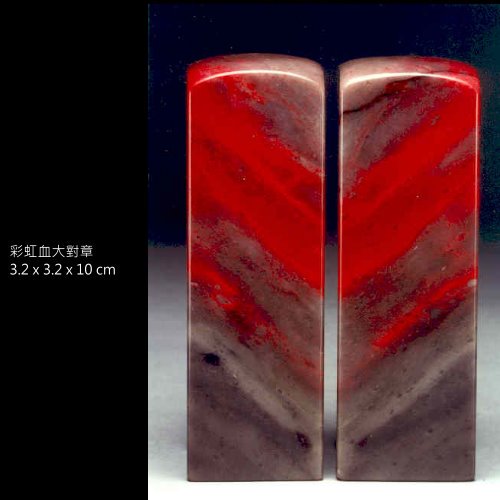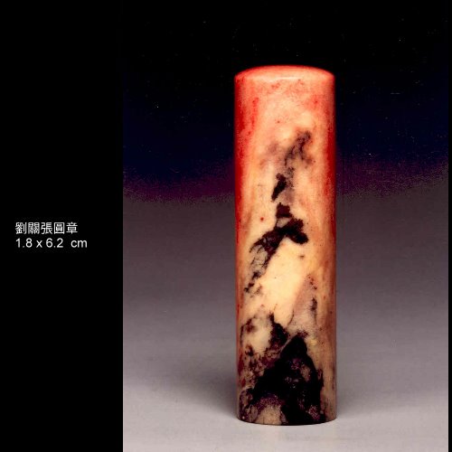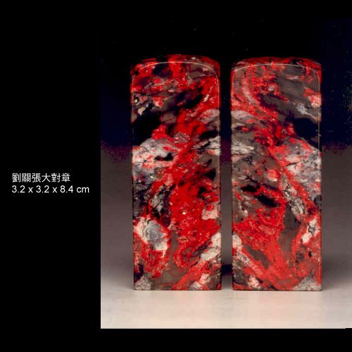 十二:劉關張雞血石:全石中具紅、黑、白三色,且紅色佔比例較多者。是昌化雞血石中極佳之品種。