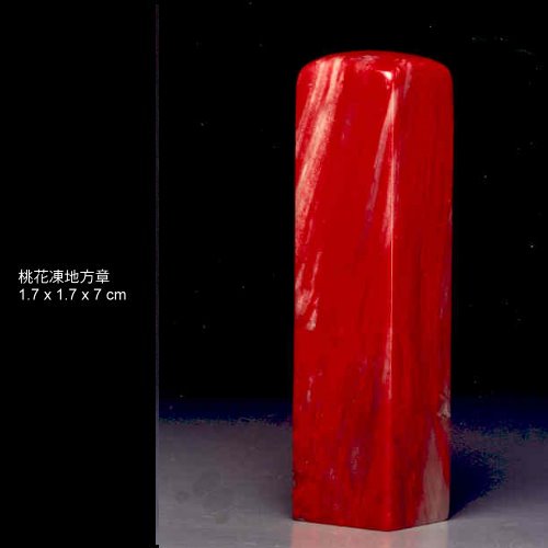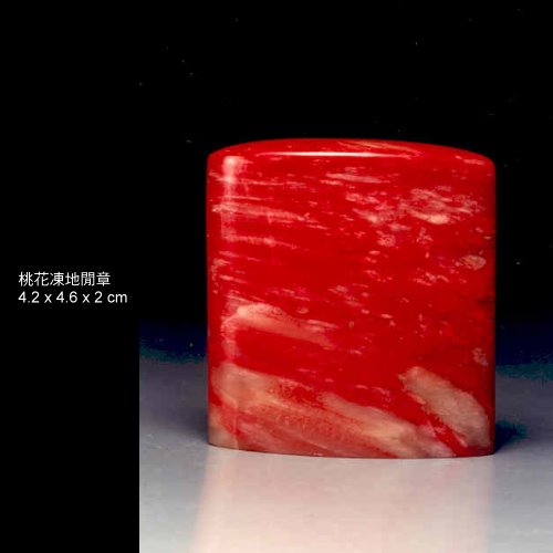、桃花地:通體淨澈,有如春之桃花瓣灑落,或大或小凝結滿佈雞血斑點,繽紛醒目,玉中透紅,為雞血石中之重要品種。